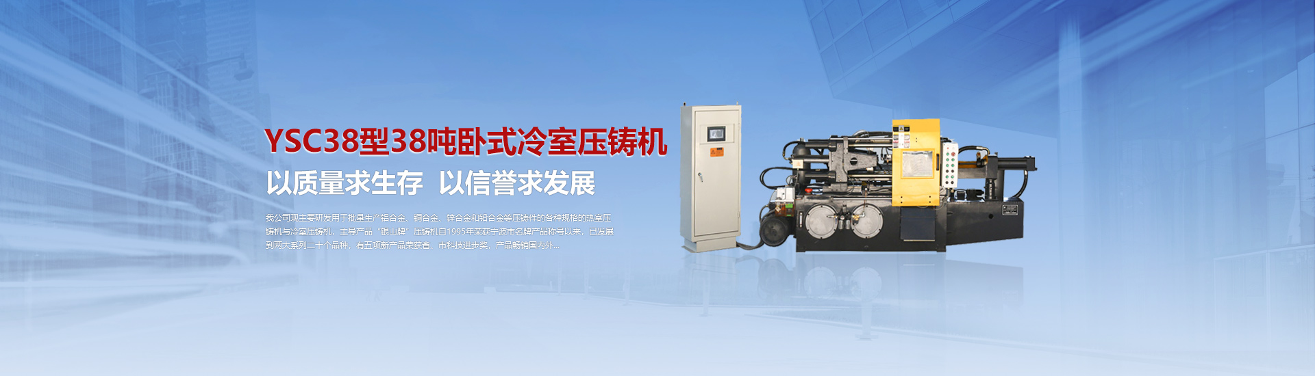 我司現(xiàn)主要研發(fā)用于批量加工生產(chǎn)鋁合金、銅合金、鋅合金和鉛合金等壓鑄件的各種型號規(guī)格的熱室/冷室壓鑄機(jī),主導(dǎo)產(chǎn)品“銀山牌”壓鑄機(jī)自1995年榮獲寧波市名牌產(chǎn)品稱號以來,已發(fā)展到兩大系列二十個品種,有五項產(chǎn)品曾榮獲省、市科技進(jìn)步獎,產(chǎn)品暢銷國內(nèi)外。歷年來向用戶提供了8000余臺設(shè)備,為中國的壓鑄工業(yè)發(fā)展作出了重要的貢獻(xiàn),企業(yè)獲得了很高的信譽(yù)度。